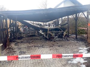 In der Nacht von Montag auf Dienstag wurden wir zur Unterstützung nach Holm alarmiert,dort wurden weitere Atemschutzträger benötigt. Vor Ort war ein Carport mitsamt 2 Autos ausgebrannt. Wir stellten für die Nachlöscharbeiten 3 Atemschutztrupps und überwachten noch 2 Atemschutztrupps aus Holm. Dies war notwendig um die Kameraden unter Atemschutz rechtzeitig durchwechseln zu können. Bei den Nachlöscharbeiten wurde das Carportdach teilweise aufgebrochen, desweiteren wurde Feuerholz, welches dort lagerte, beiseite geschafft. Zur Brandursache und dem entstandenen Sachschaden kann die Feuerwehr keine Angaben machen.
