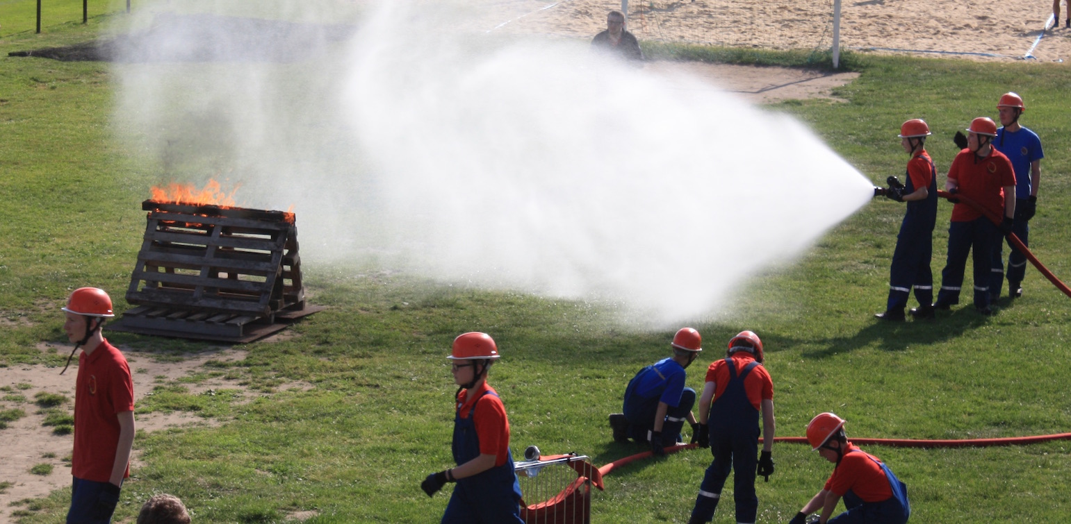 Der Höhepunkt des Tages war die Übung der  Jugendfeuerwehr. Ein brennendes Holzhaus (aus Europaletten) war zu löschen. Nach dem Antreten hinter dem Fahrzeug wurde der Löschangriff selbständig aufgebaut und die Nachwuchs-Feuerwehrleute löschten das Feuer rasch.